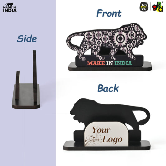 Make In India Themed Visiting Card Stand, Decorative Lion Gear Pattern Design