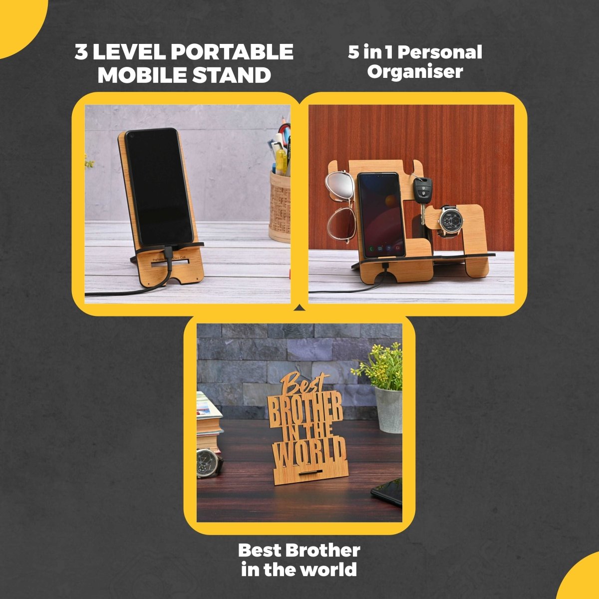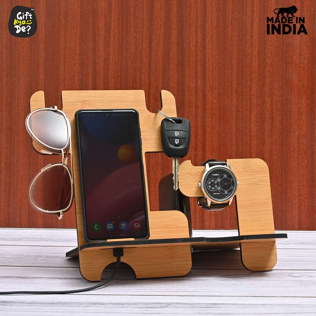 Our wooden 5 in 1 accessory organizer features a tray for mobile, a U- shaped cutout for key chains, sunglasses, watch holder and a small space for a wallet.