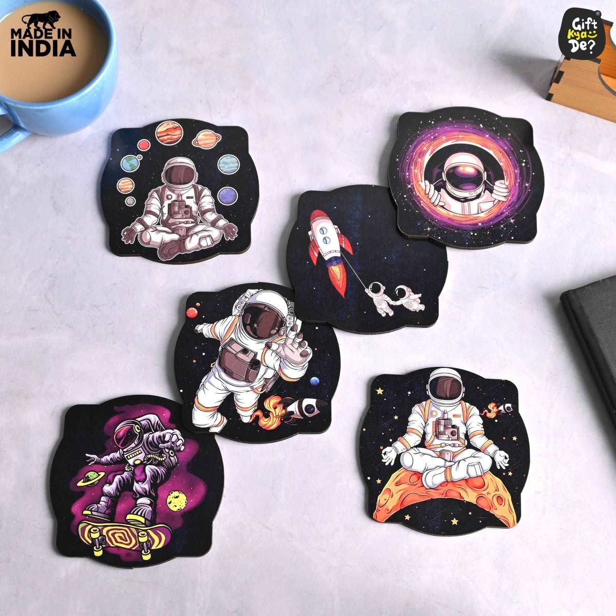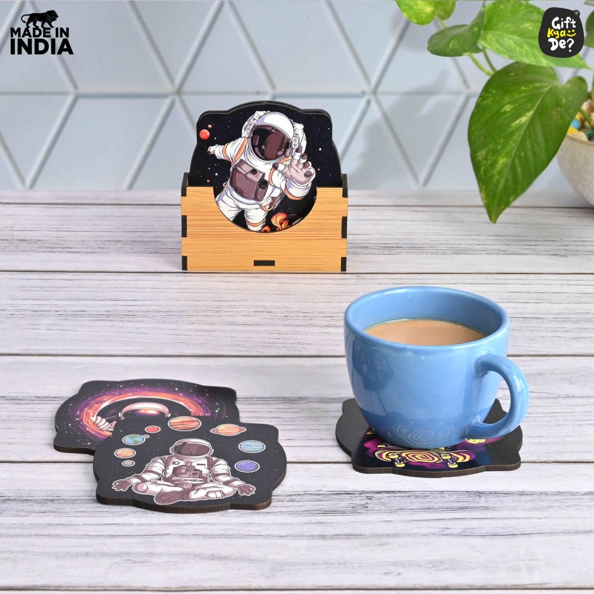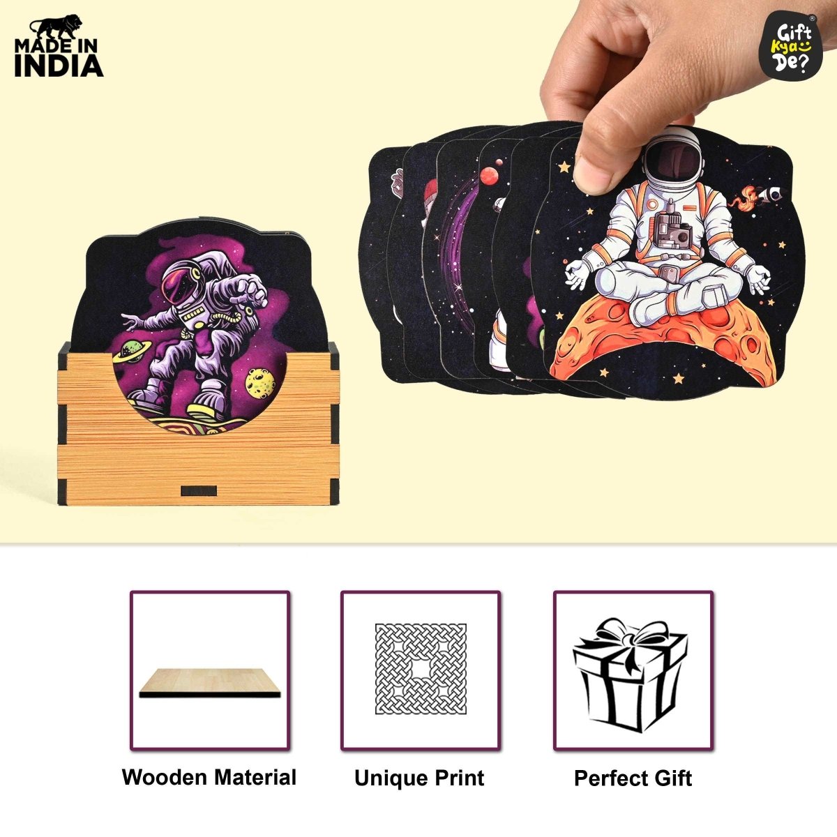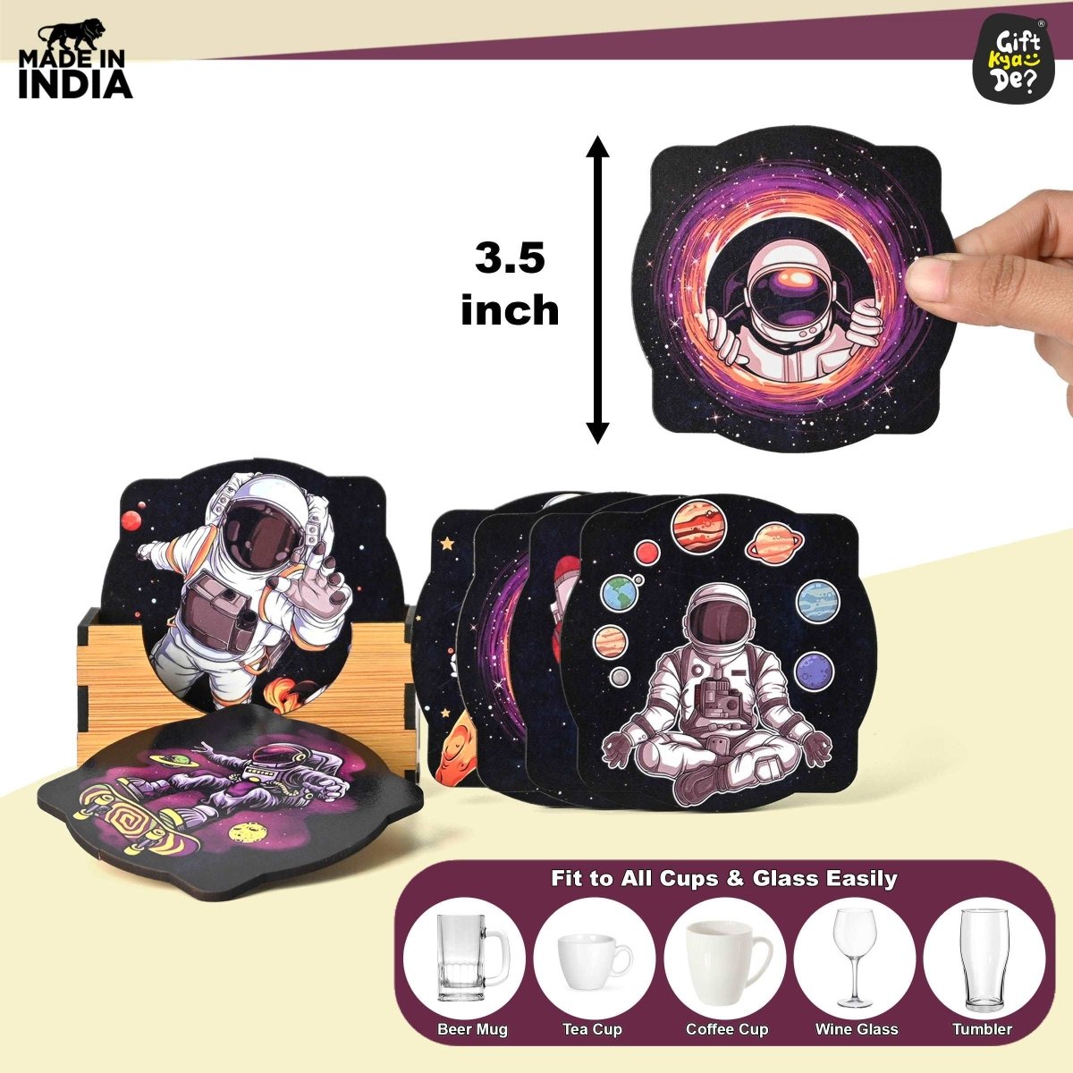 Coaster Set of 6 Mayan Art & Astronaut Design | Wooden Coasters to Serve Tea Cups, Coffee Mugs and Glasses