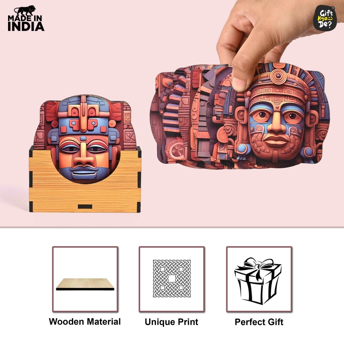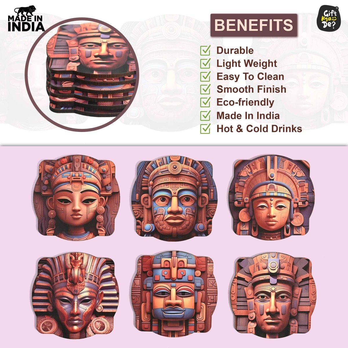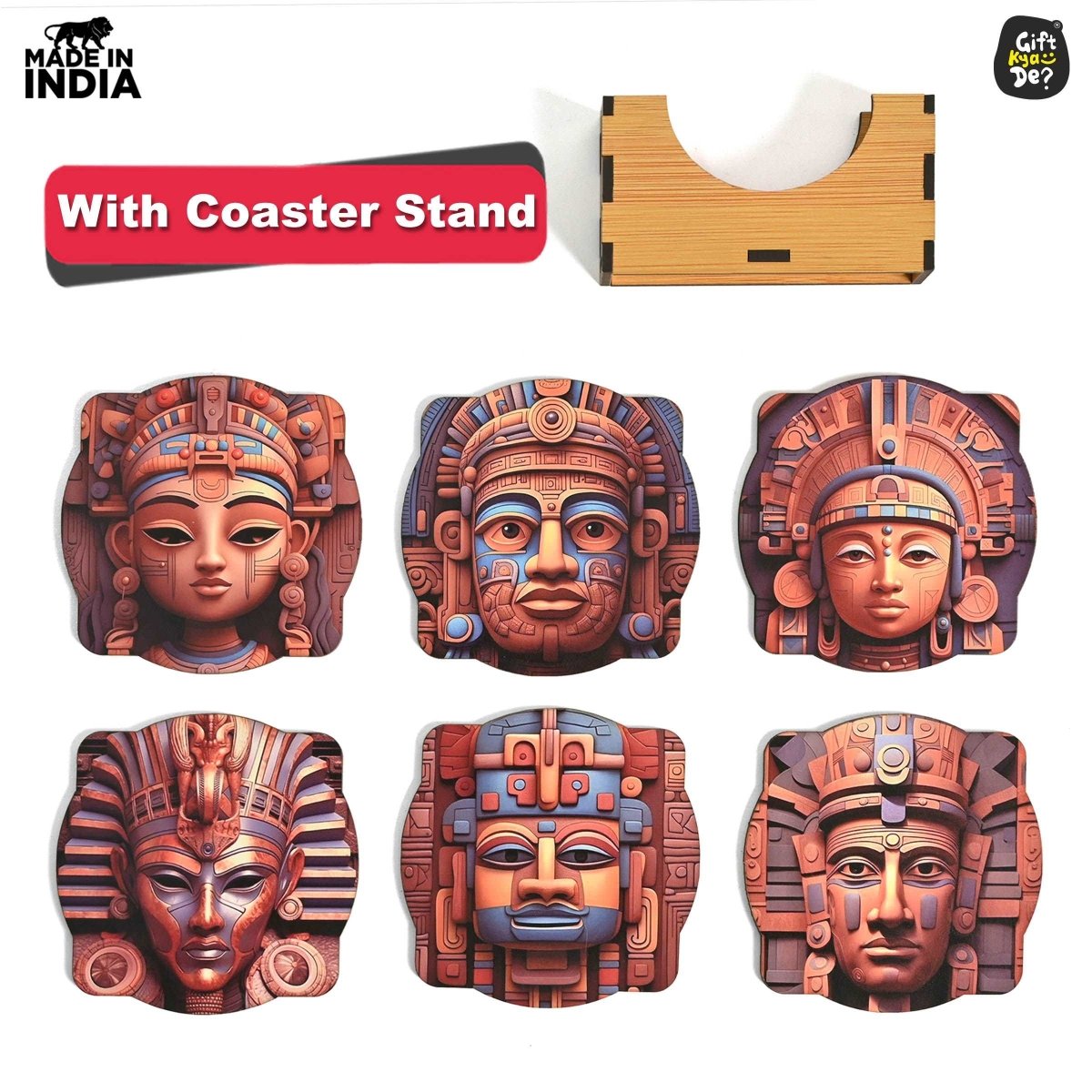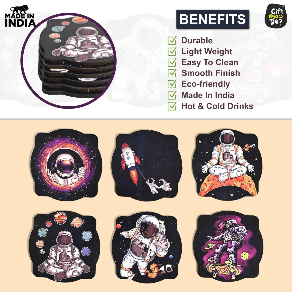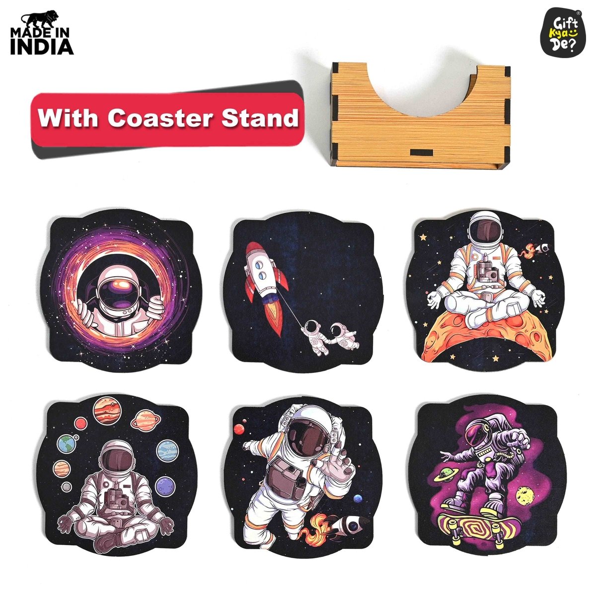 Coaster Set of 6 Mayan Art & Astronaut Design | Wooden Coasters to Serve Tea Cups, Coffee Mugs and Glasses