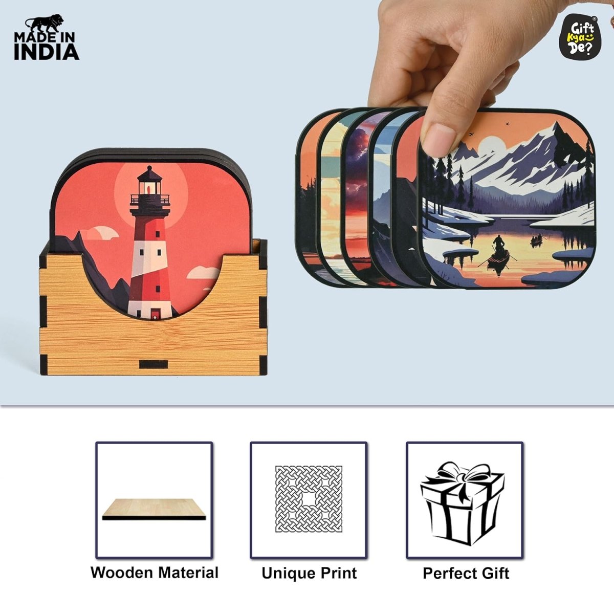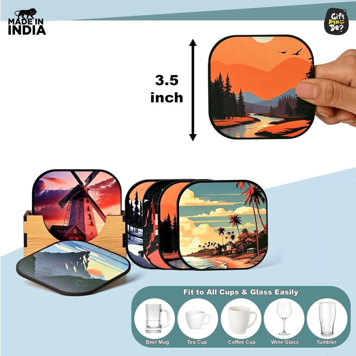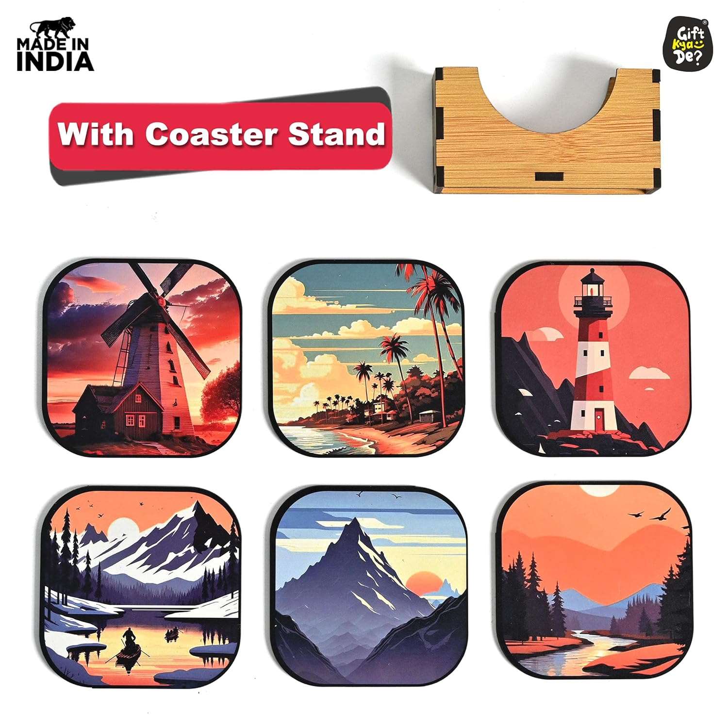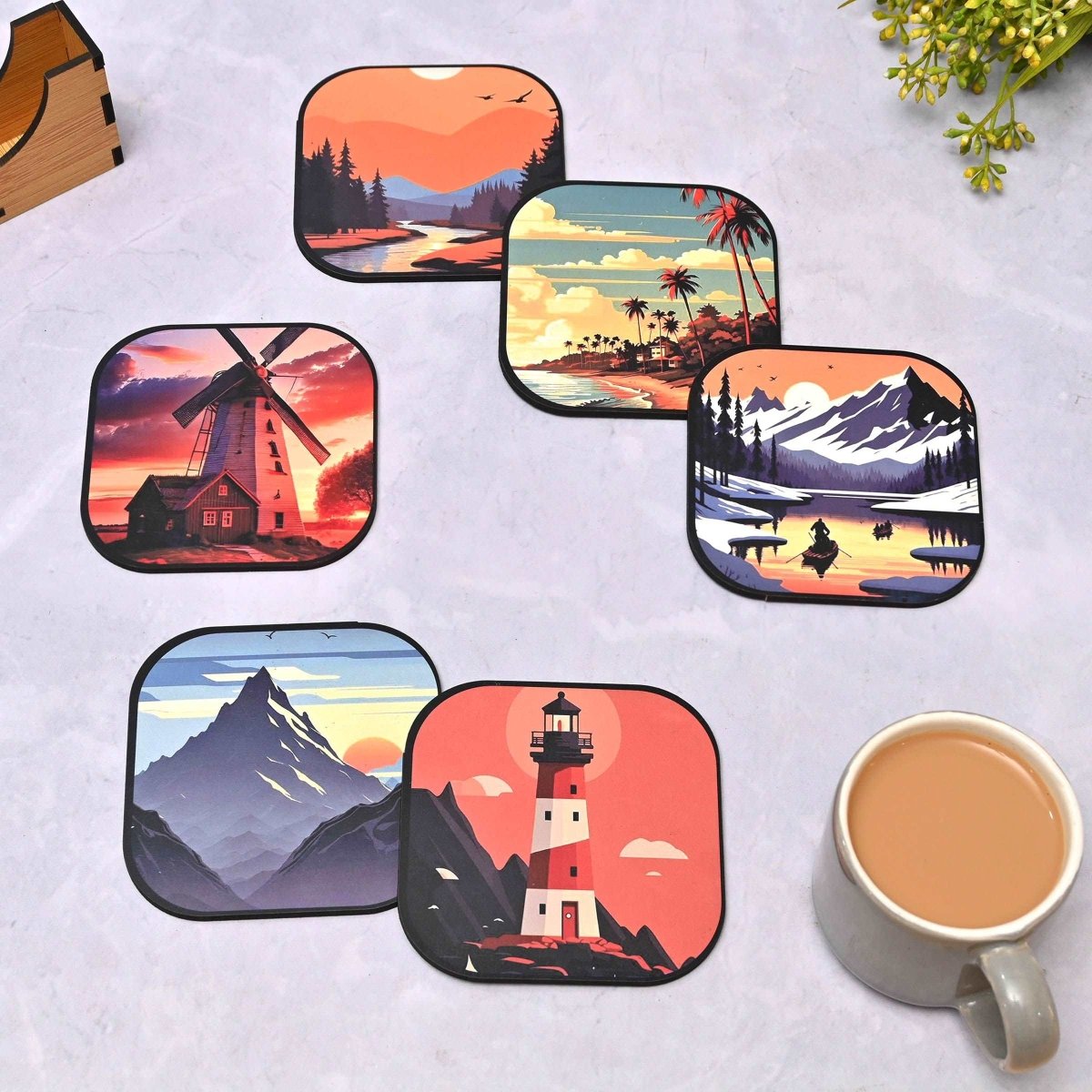 Coaster Set of 6 Nature & Travel Theme Design | Wooden Coasters to Serve Tea Cups, Coffee Mugs and Glasses