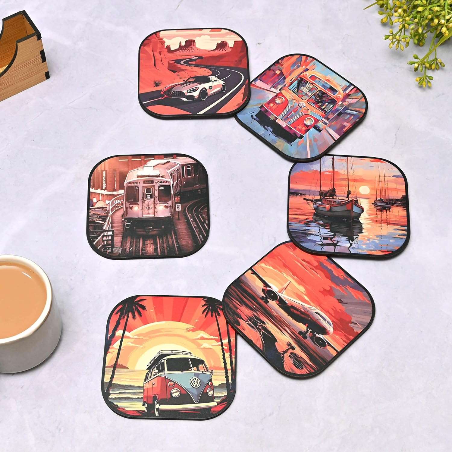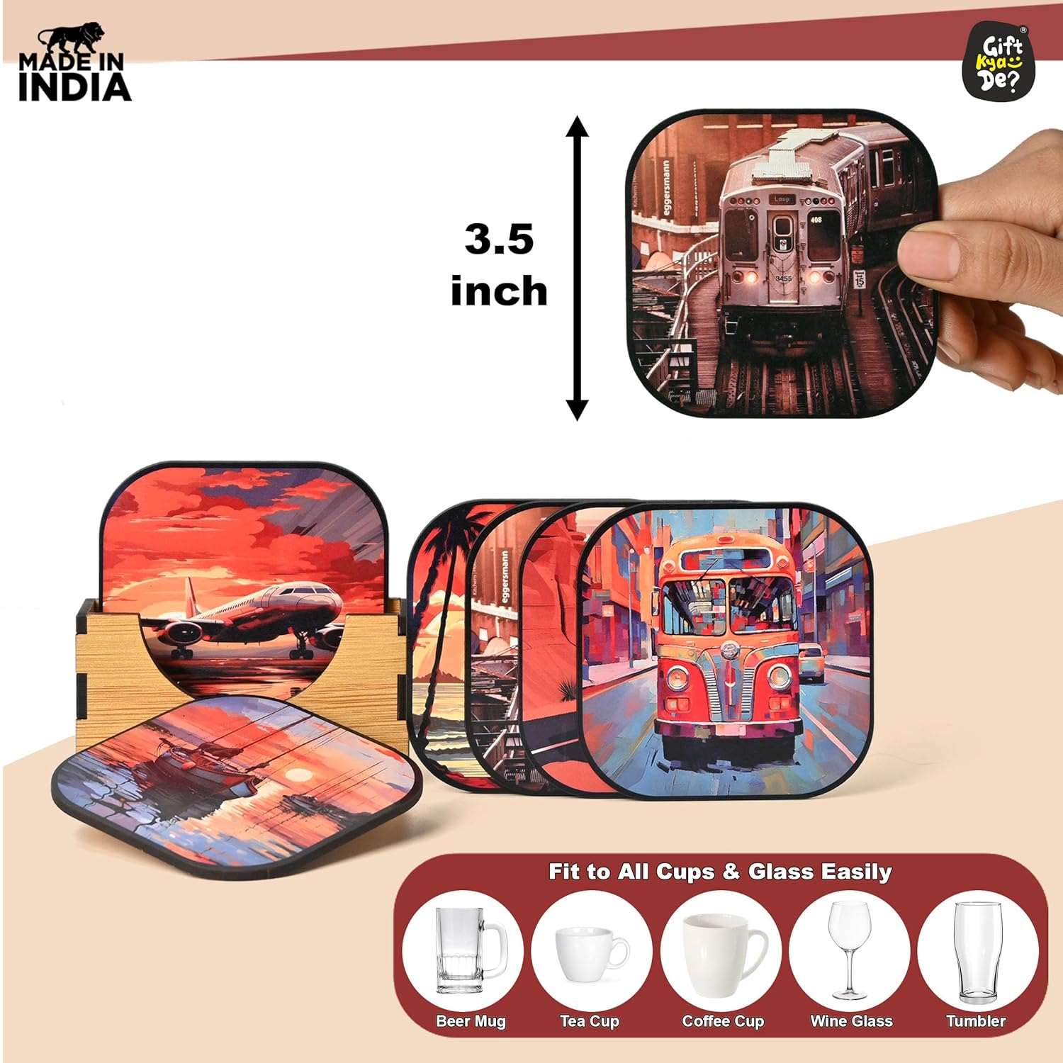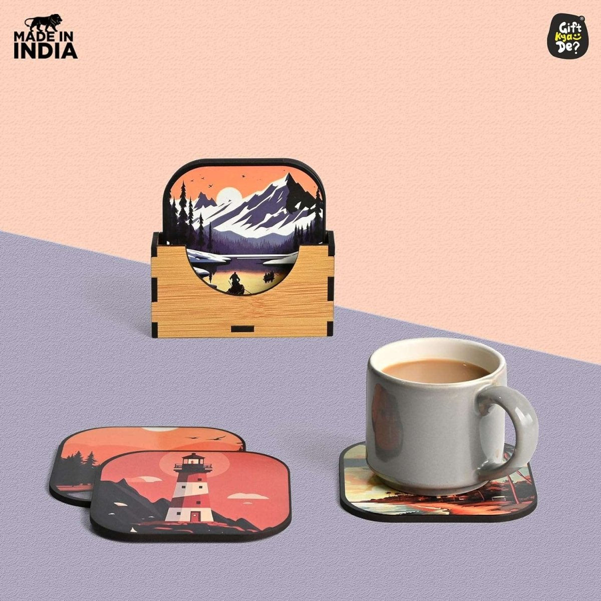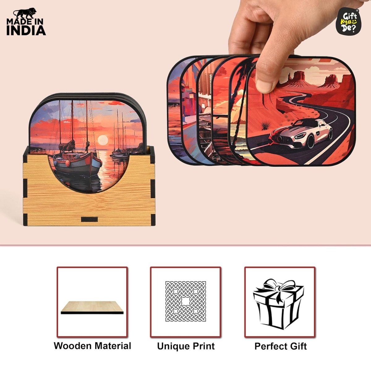 Coaster Set of 6 Nature & Travel Theme Design | Wooden Coasters to Serve Tea Cups, Coffee Mugs and Glasses