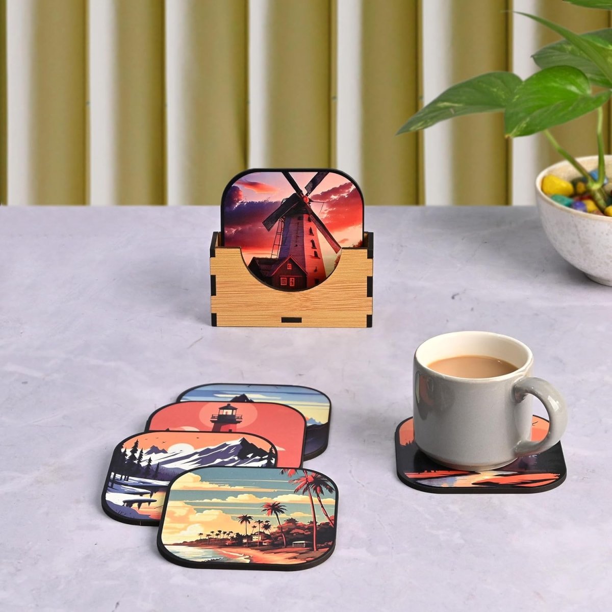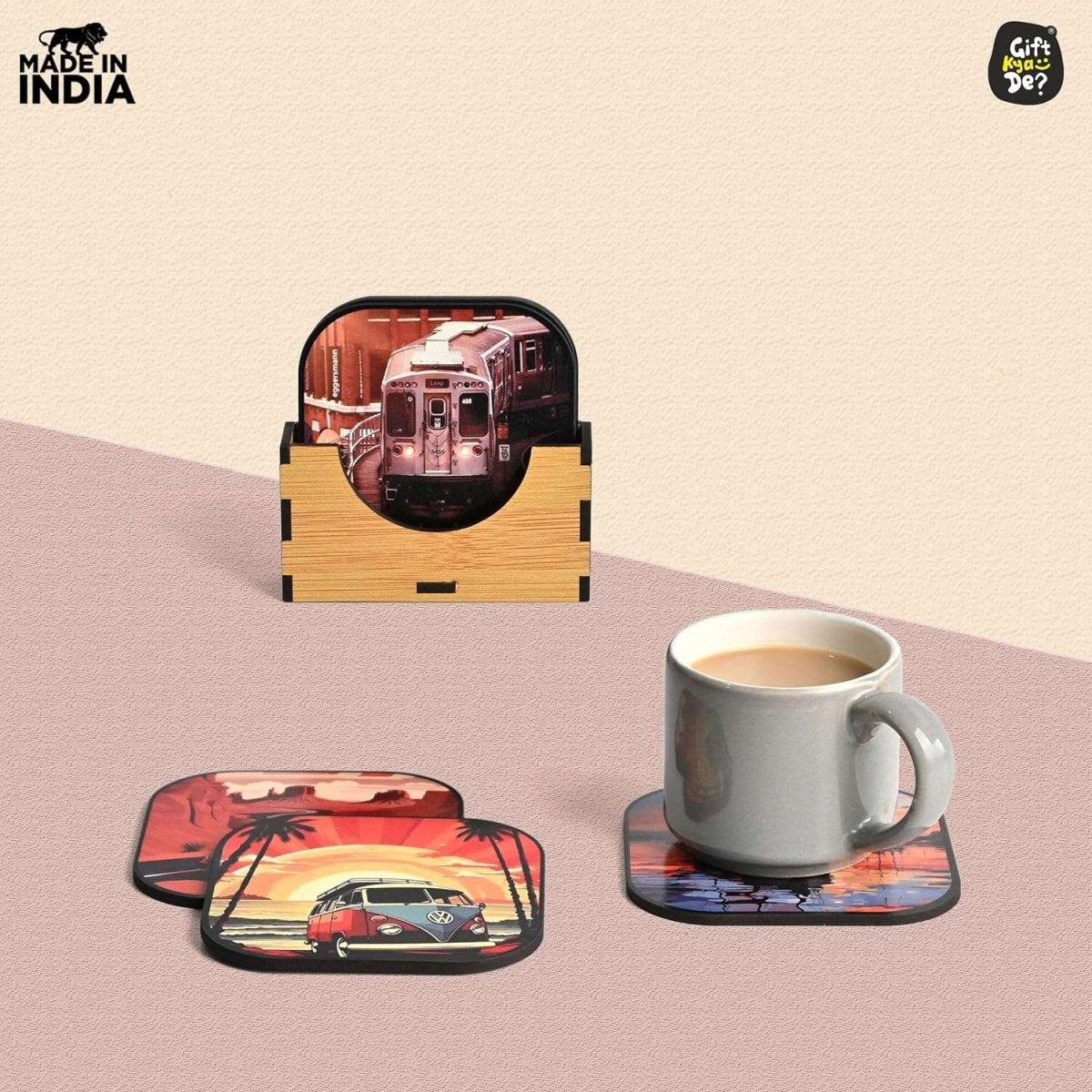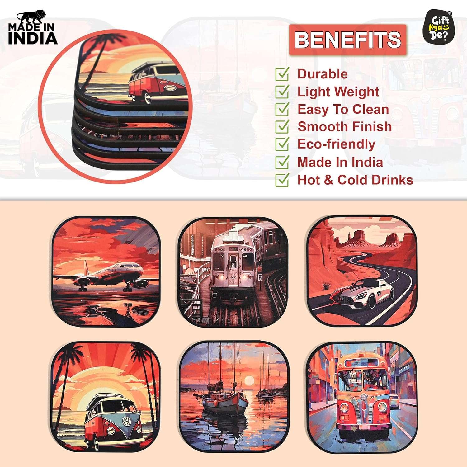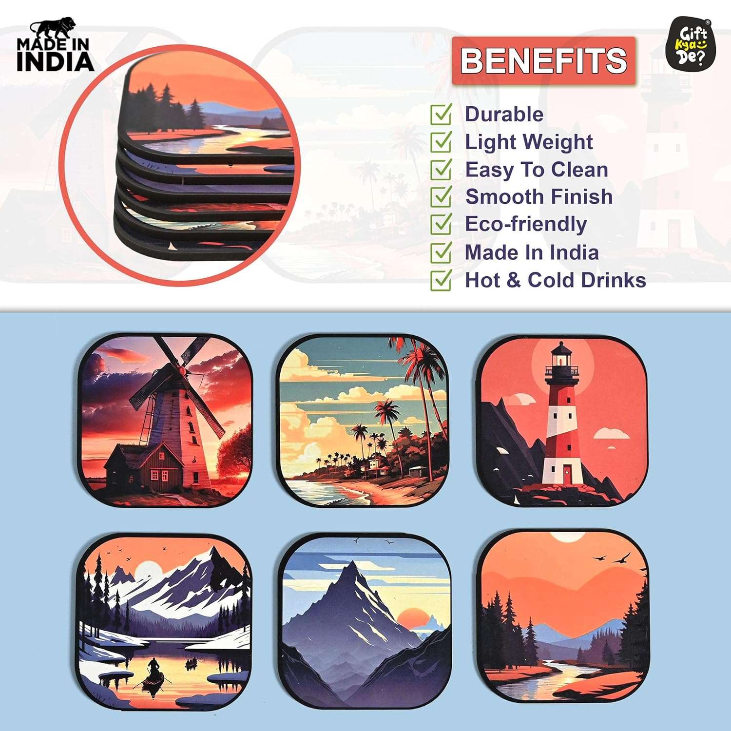 Coaster Set of 6 Nature & Travel Theme Design | Wooden Coasters to Serve Tea Cups, Coffee Mugs and Glasses