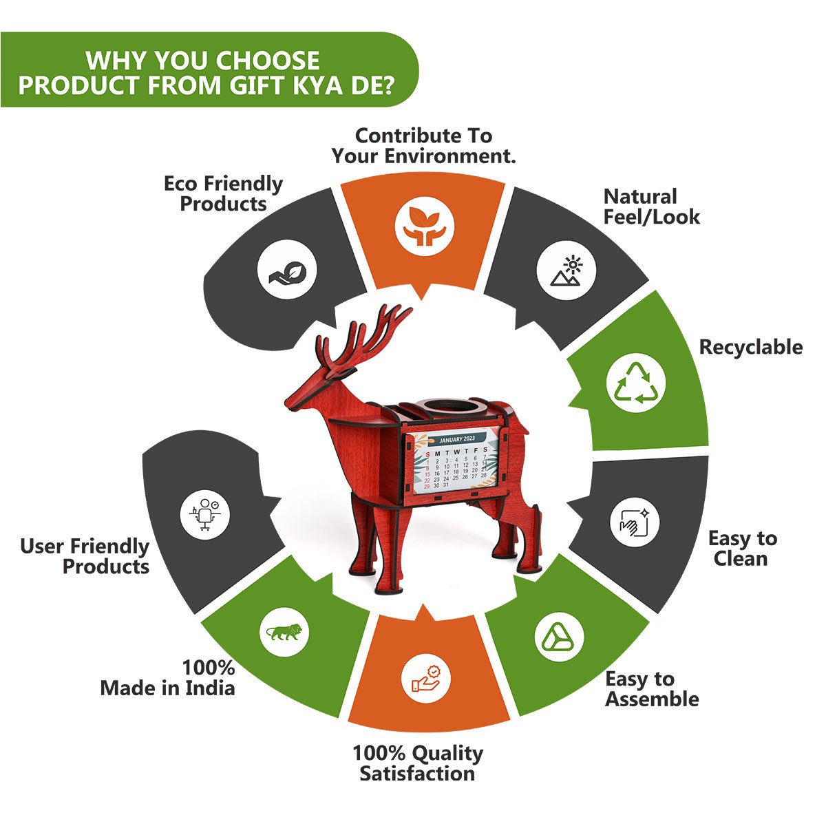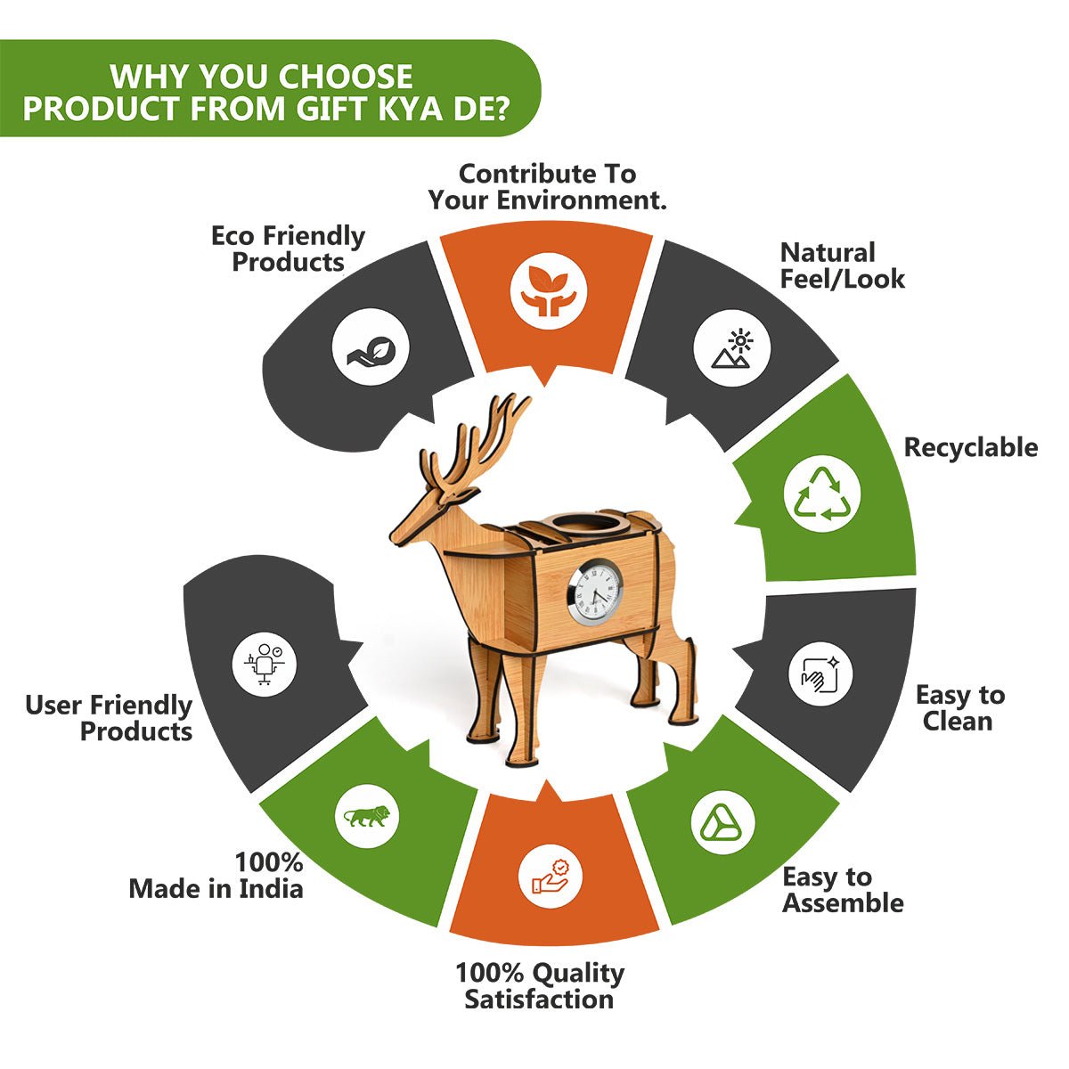 Multi-purpose desk organizer: Get your office desk decorative items arranged in decent order with this wooden multifunctional can store small stationary items for kids. This decorative deer showpiece stands securely on a desk or other flat surface, holds craft supplies items like pens, pencils, sketch pens, and promotional pens, and can keep visiting cards. And a calendar and clock are also there to keep you updated. Helps organize all cute stationary items in an organized way. A wooden body with rich brown polish gives a sophisticated decor to your home decor lucky deer family.