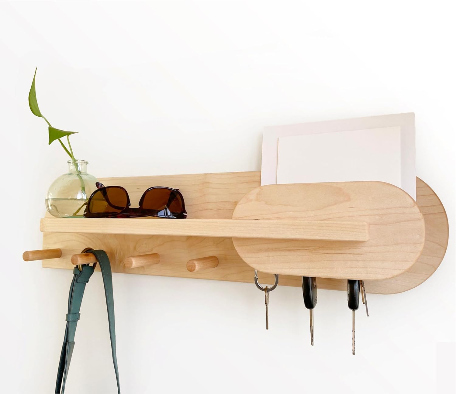 - STORAGE CAPACITY: Integrated shelf perfect for sunglasses, mail, keys, and decorative items, with pegs below for coats and bags