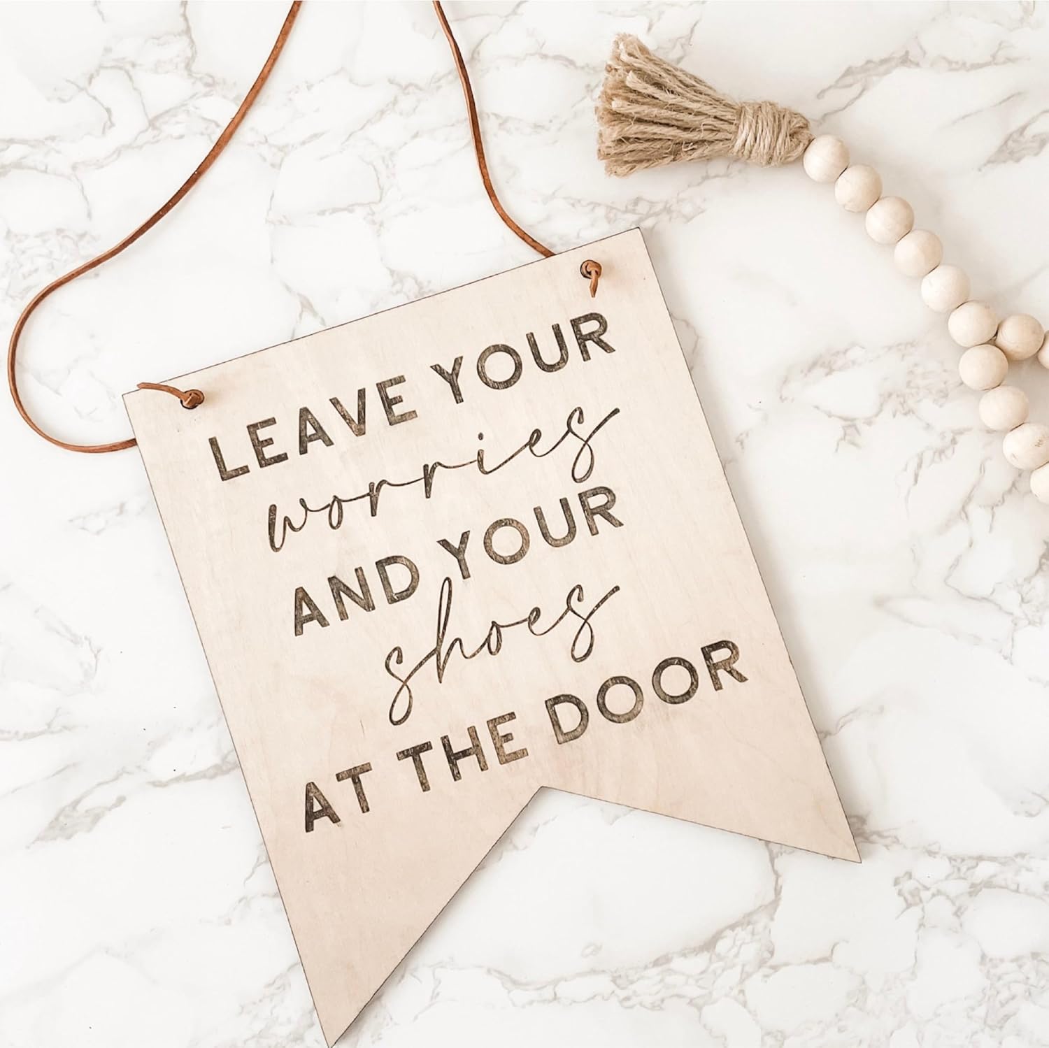 - DURABLE DESIGN: Made of Laminated Enginerred Wood and adhesive backing, this self-adhesive "Remove Your Shoes, Leave Your Worries at the Door" sign will last for years without fading or peeling