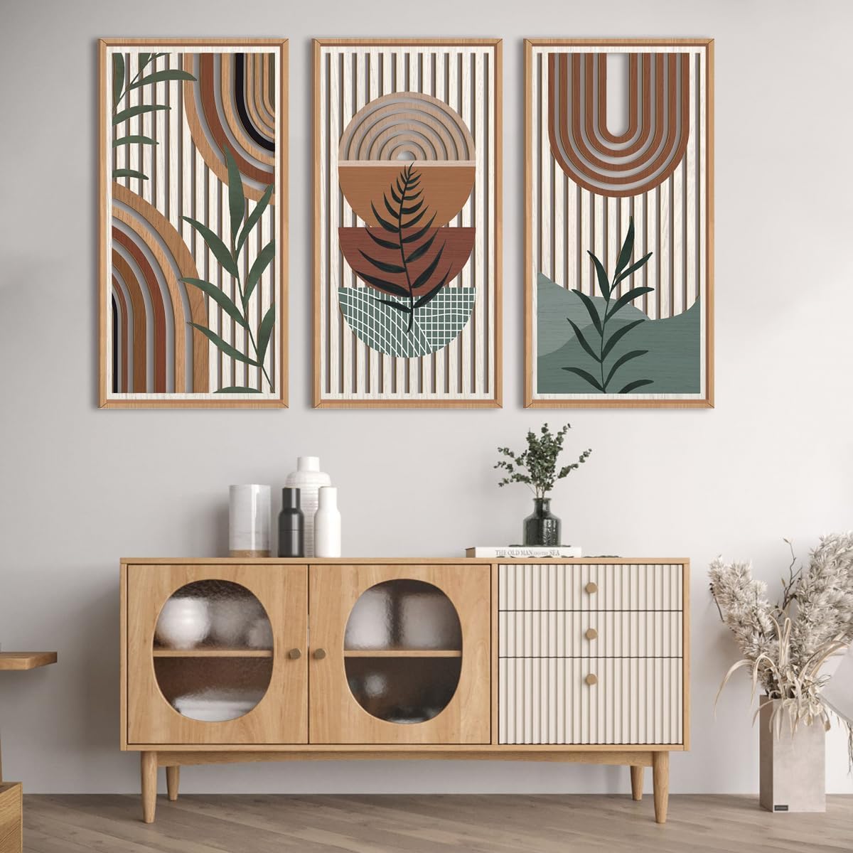 - Stylish Wall Art: This set of 3 framed wall plates features abstract geometric designs in earthy tones, perfect for adding a touch of mid-century modern flair to any living space.