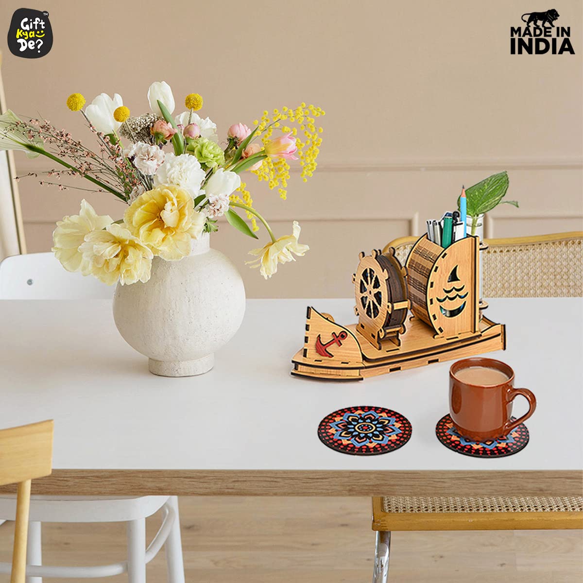 Elegant Table Accessories: TheBoat shape wooden coaster set of 6 with the cute test tube planterare nice table accessories adding a touch of Indian elegance with their creative design. Thisplant holder for homedecor is a perfect addition to your home.