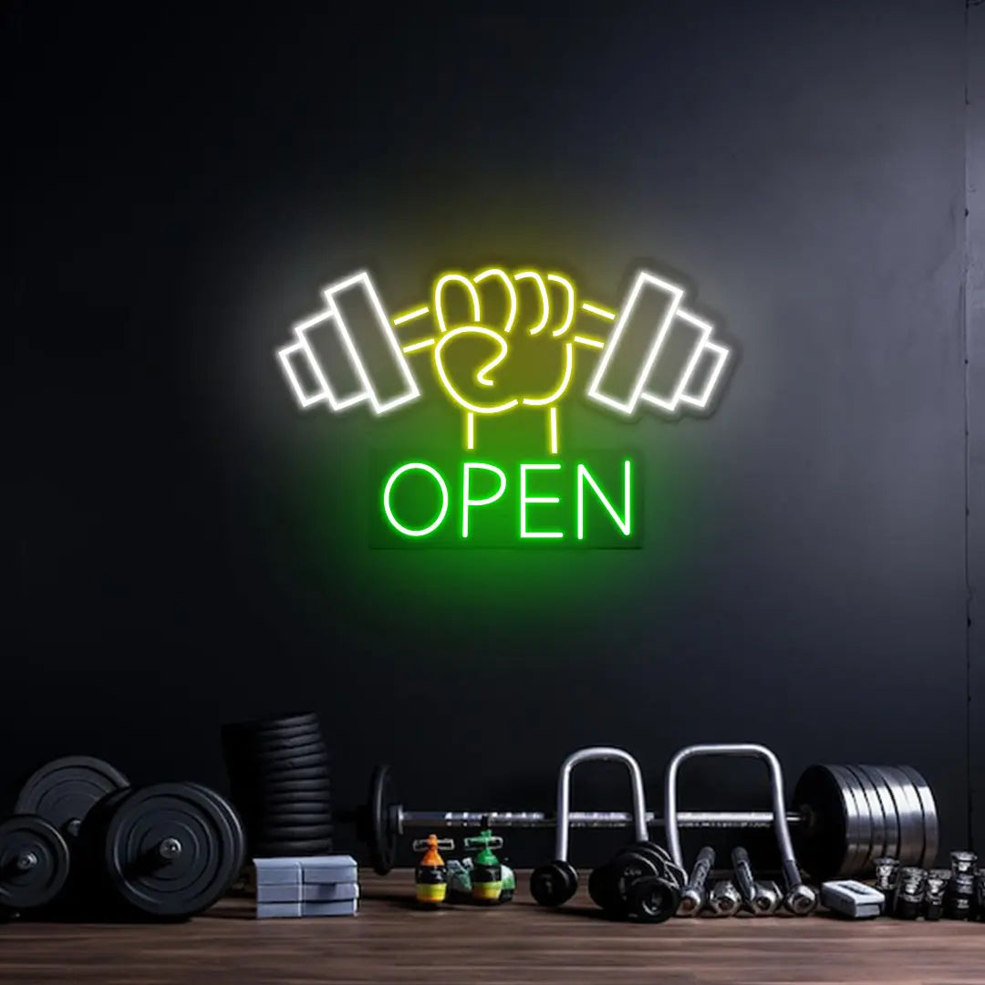 Motivate your fitness journey with the Gyms Neon Sign from Neon by FusionNeon. This glowing neon sign features an Open message, perfect for home gyms, fitness centers, or personal training studios. This neon light is the perfect addition to your workout space, whether you're building muscle, staying fit, or running a fitness business. It adds a dynamic and energizing touch that will elevate your space. The bold design and vibrant glow provide the extra motivation needed to achieve your fitness goals.