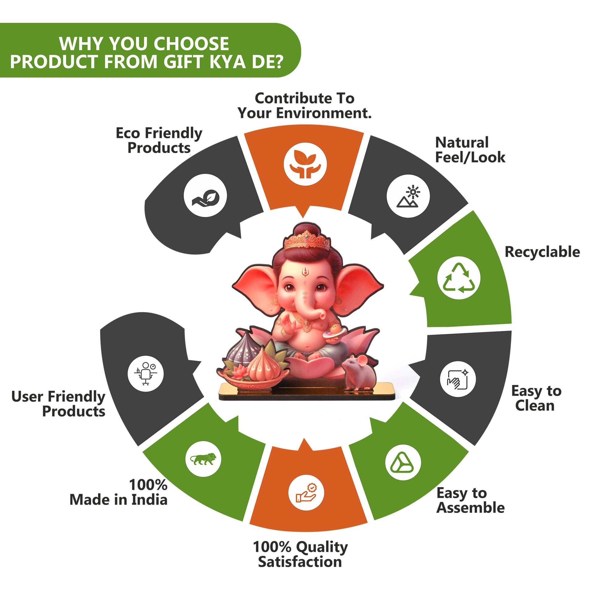 - Beautiful Design: Handcrafted wooden table top frame featuring Lord Ganesha seated on a lotus with his Modak and mouse.