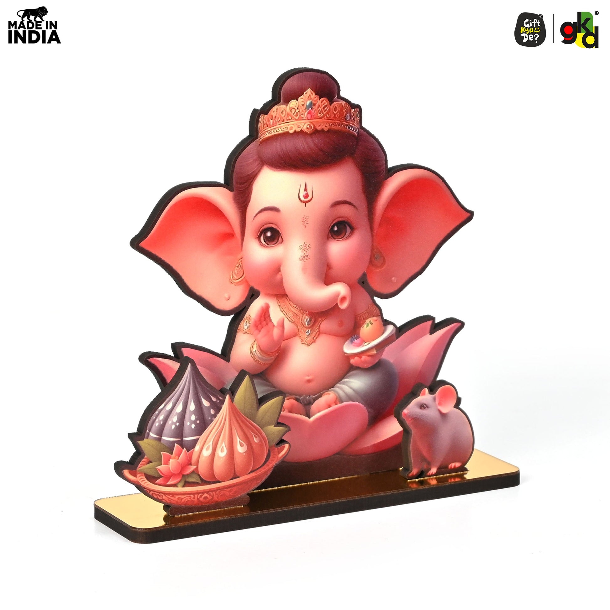 Lord Ganesh Wooden Table Top Frame with Modak and Mouse | Divine Ganesha Idol for Home, Office & Gift Purposes | Spiritual Home Décor 6x5