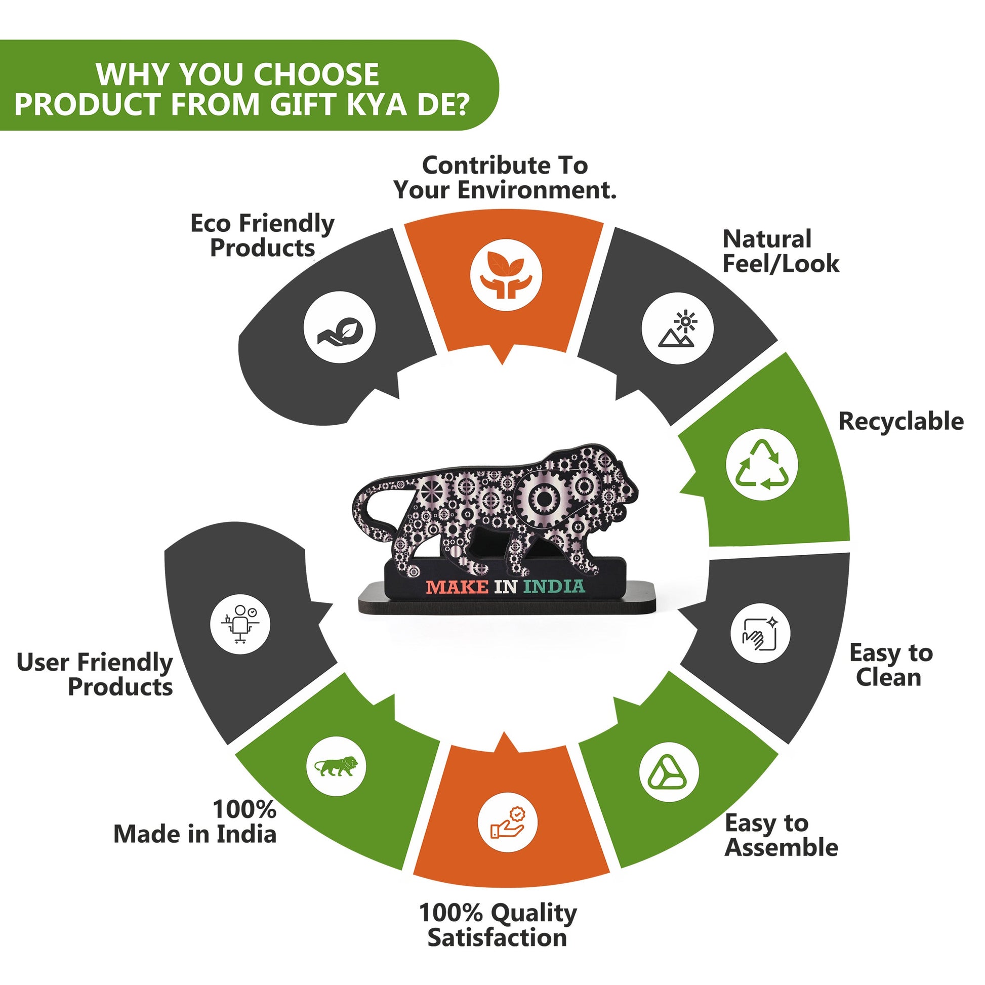Celebrate India's industrial spirit with this striking decorative visiting card holder featuring a majestic lion silhouette crafted from premium engineered wood. The lion's body is intricately detailed with mechanical gears and cogs in metallic silver tones against a black backdrop, symbolising India's manufacturing prowess.