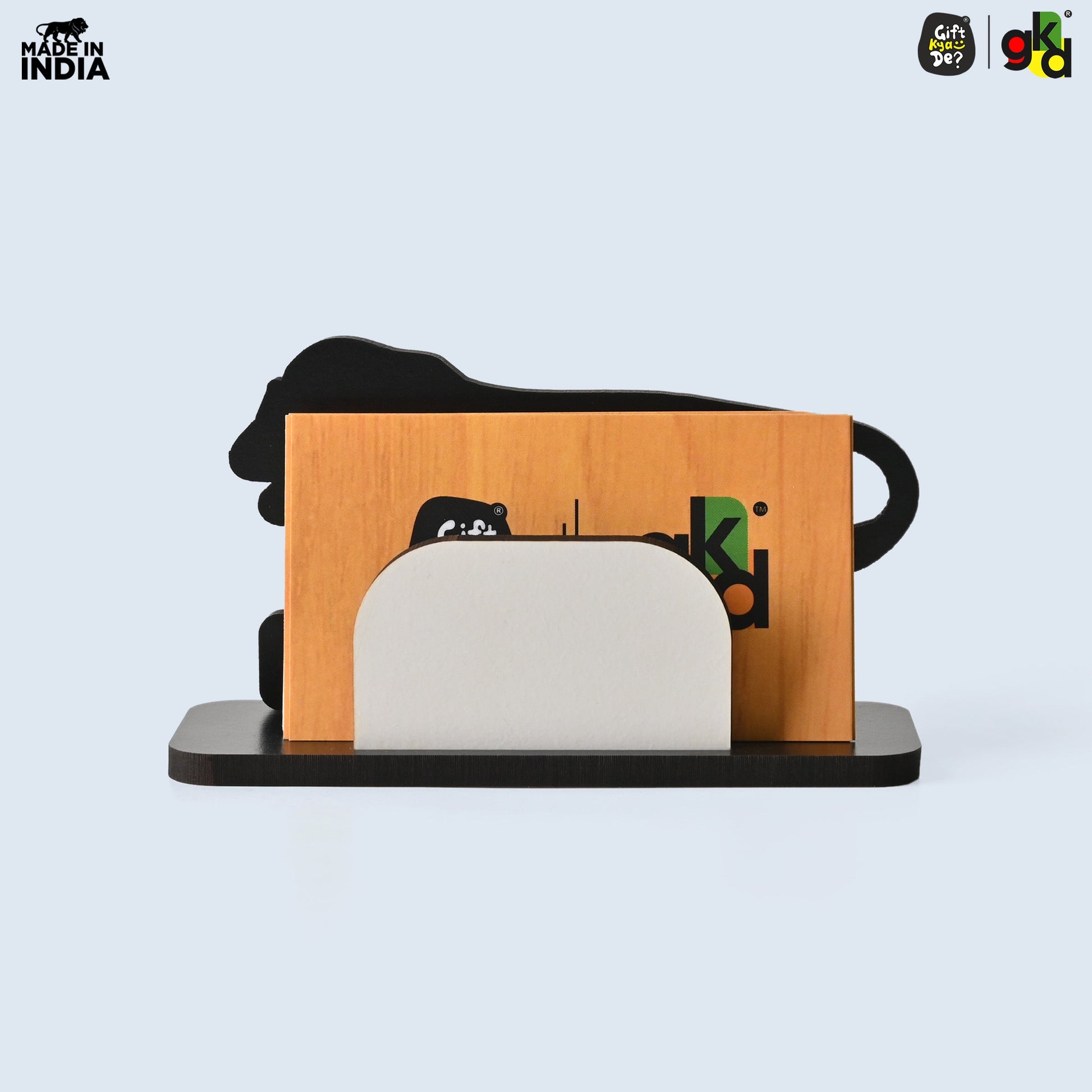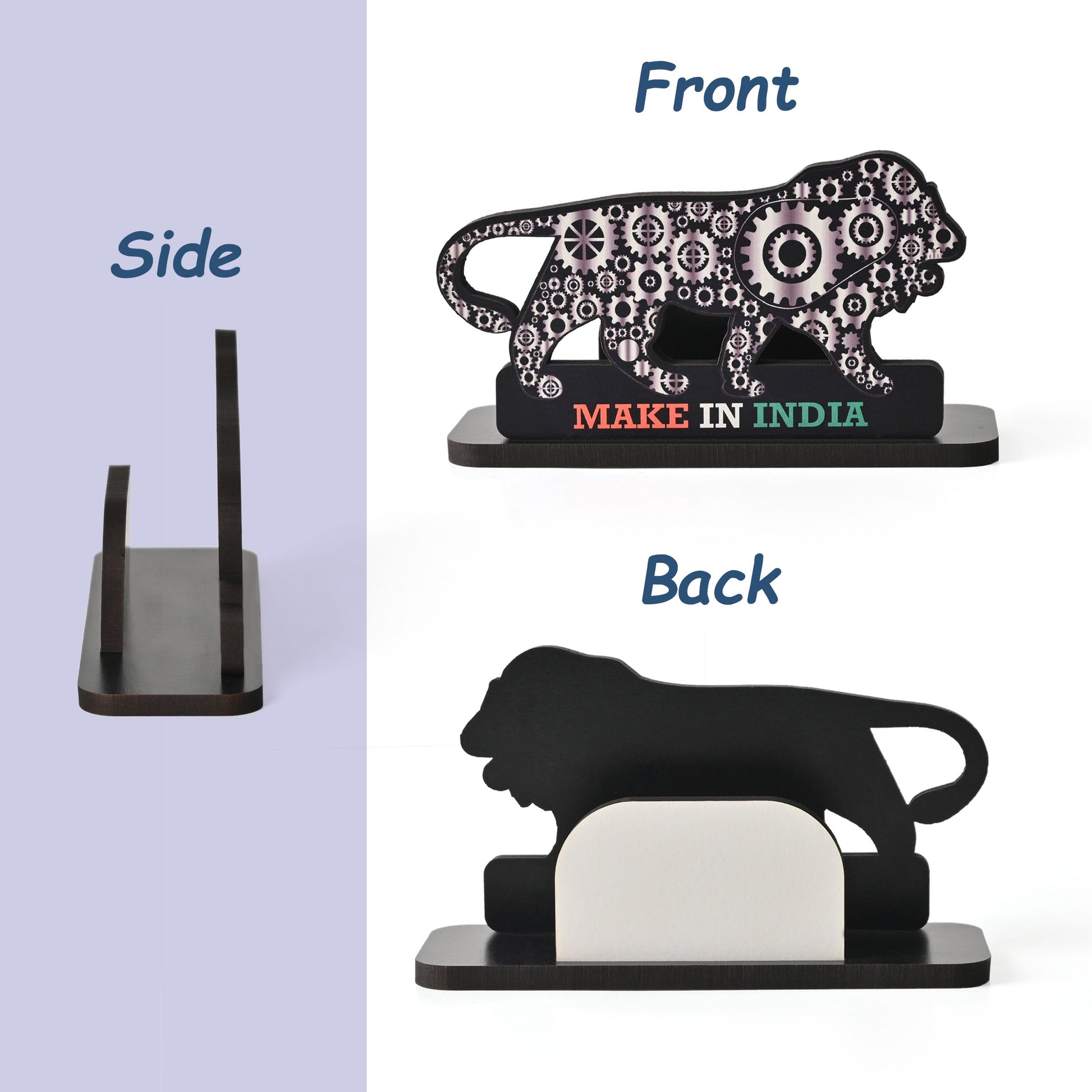 - DESIGN: Decorative wooden visiting card holder featuring a lion silhouette filled with intricate gear patterns in silver and black colours.