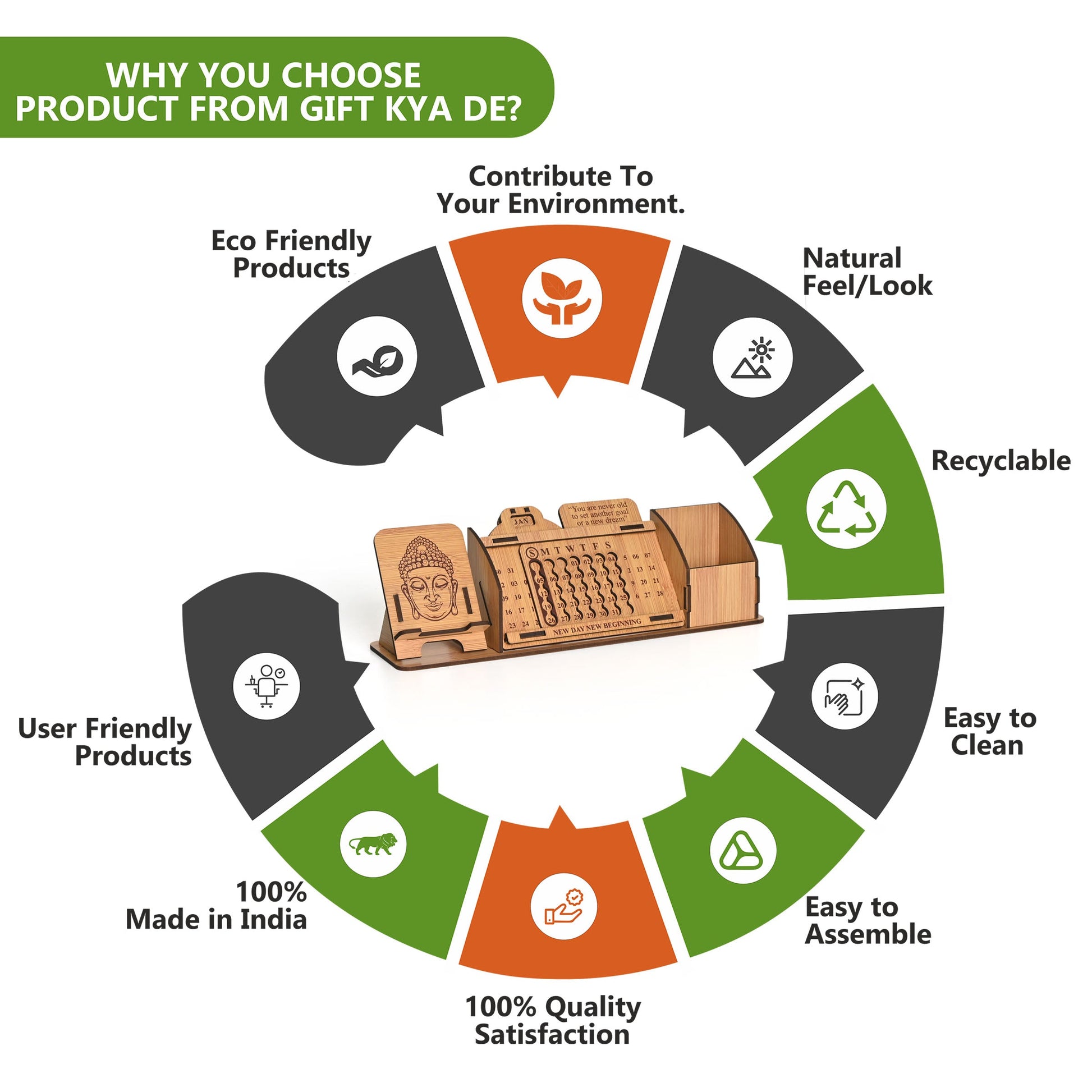 The hand-made desk organizer cum calendar is not only good for classifying the items but also is beautiful and artistic with Lifetime and Infinite calendars with all one stationery organizer and pen holder the most important Mobile stand. Buddha Ji photo engraved fine laser cut finish and is used as a desk organizer for study tables, and office tables. Motivational Message You are Never old to set another Goal or a New Dream.
