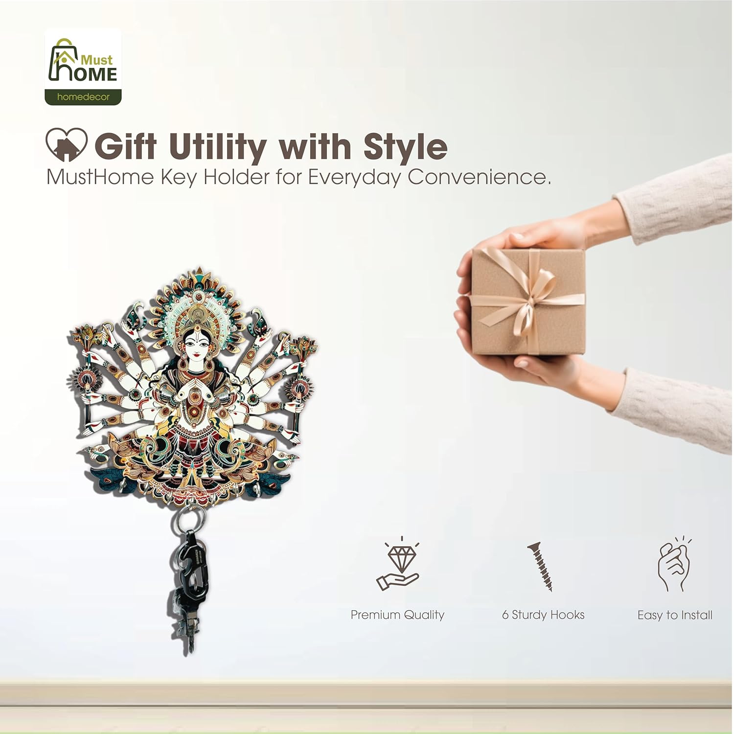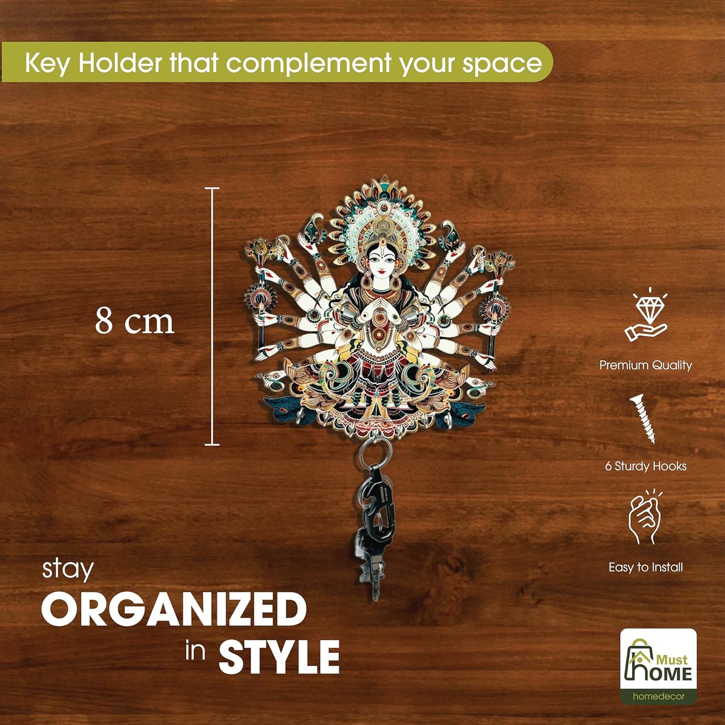 MustHome Premium Durga Ji Wooden Key Holder, 6 Hooks|20 x 10 cm