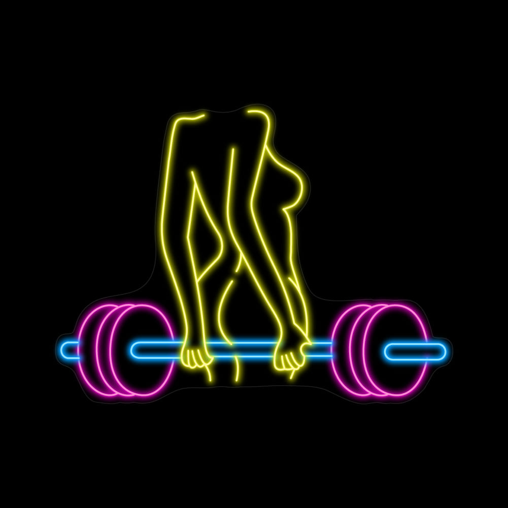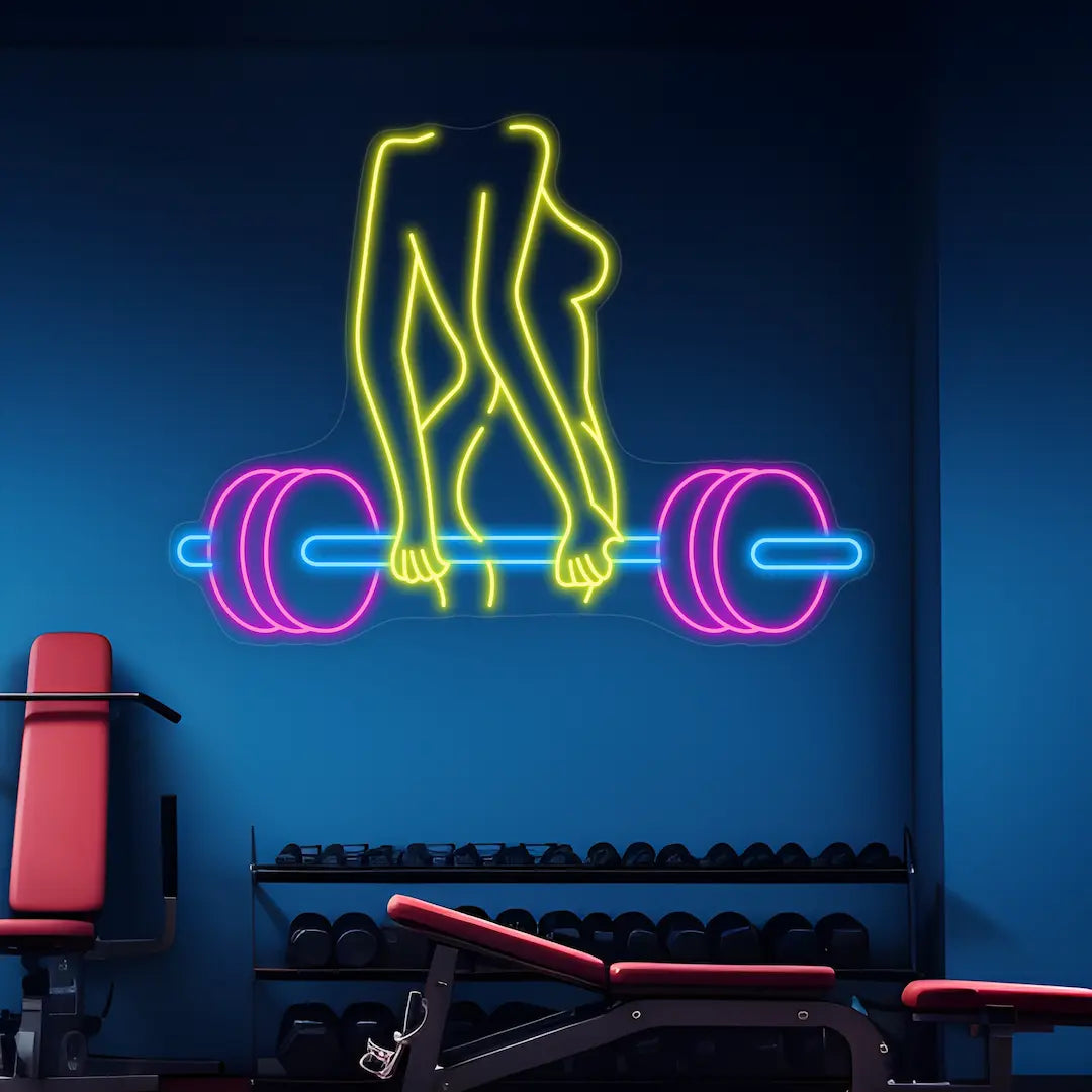 Bring a powerful and feminine touch to your gym with the Neon Woman Barbell Sign LED Light from Neon by FusionNeon. This striking neon sign features a silhouette of a woman lifting a barbell, perfect for motivating anyone in your workout space. It’s ideal for fitness studios, home gyms, or women-centric workout areas. This sign is the perfect fit whether you're decorating your gym or adding motivation to your workouts.