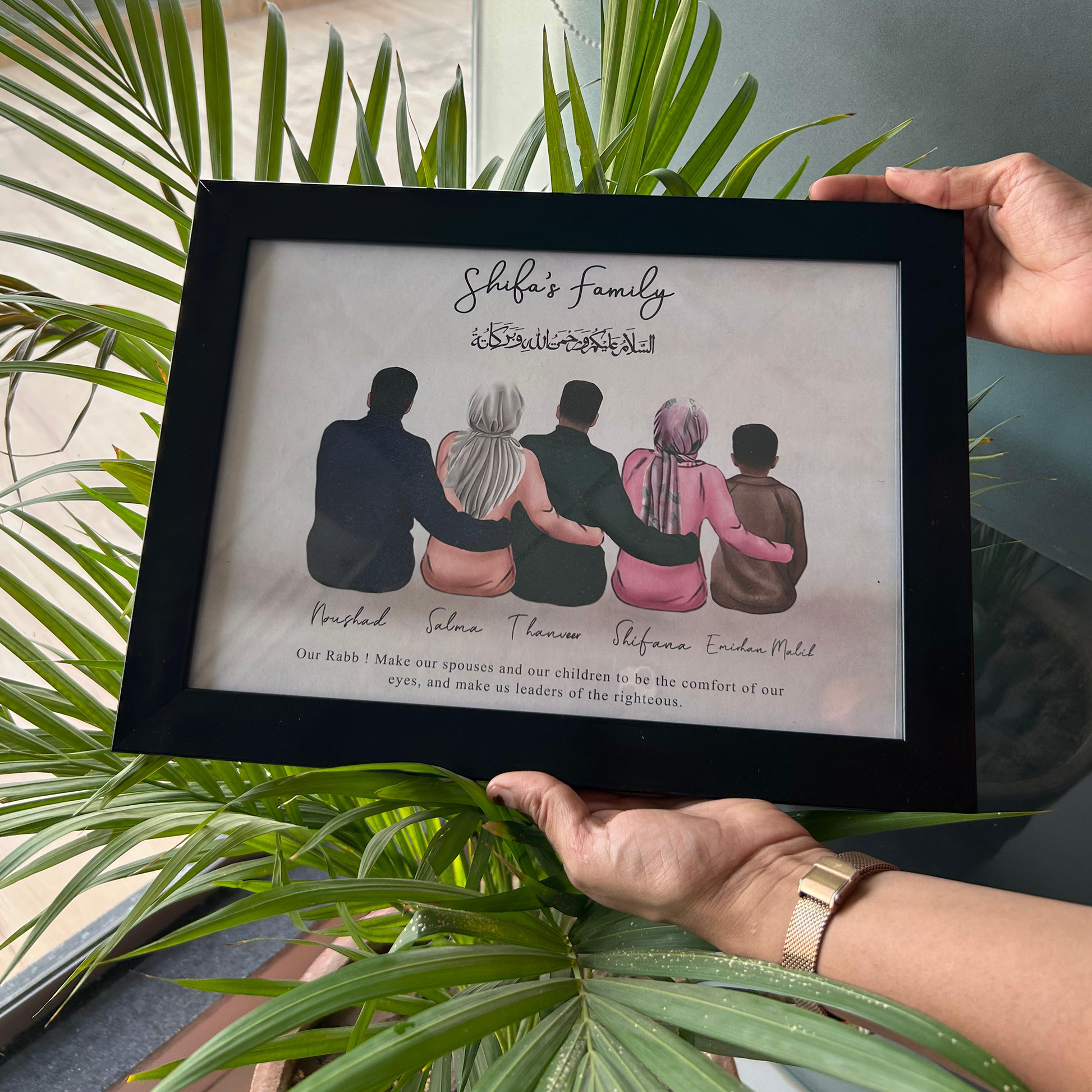 Celebrate the beauty of family with our Personalised Muslim Family Print—a heartfelt and artistic representation of your loved ones. Thoughtfully designed with Islamic elements, this bespoke print showcases each family member in a stunning illustration, complete with names and optional quotes or duas.