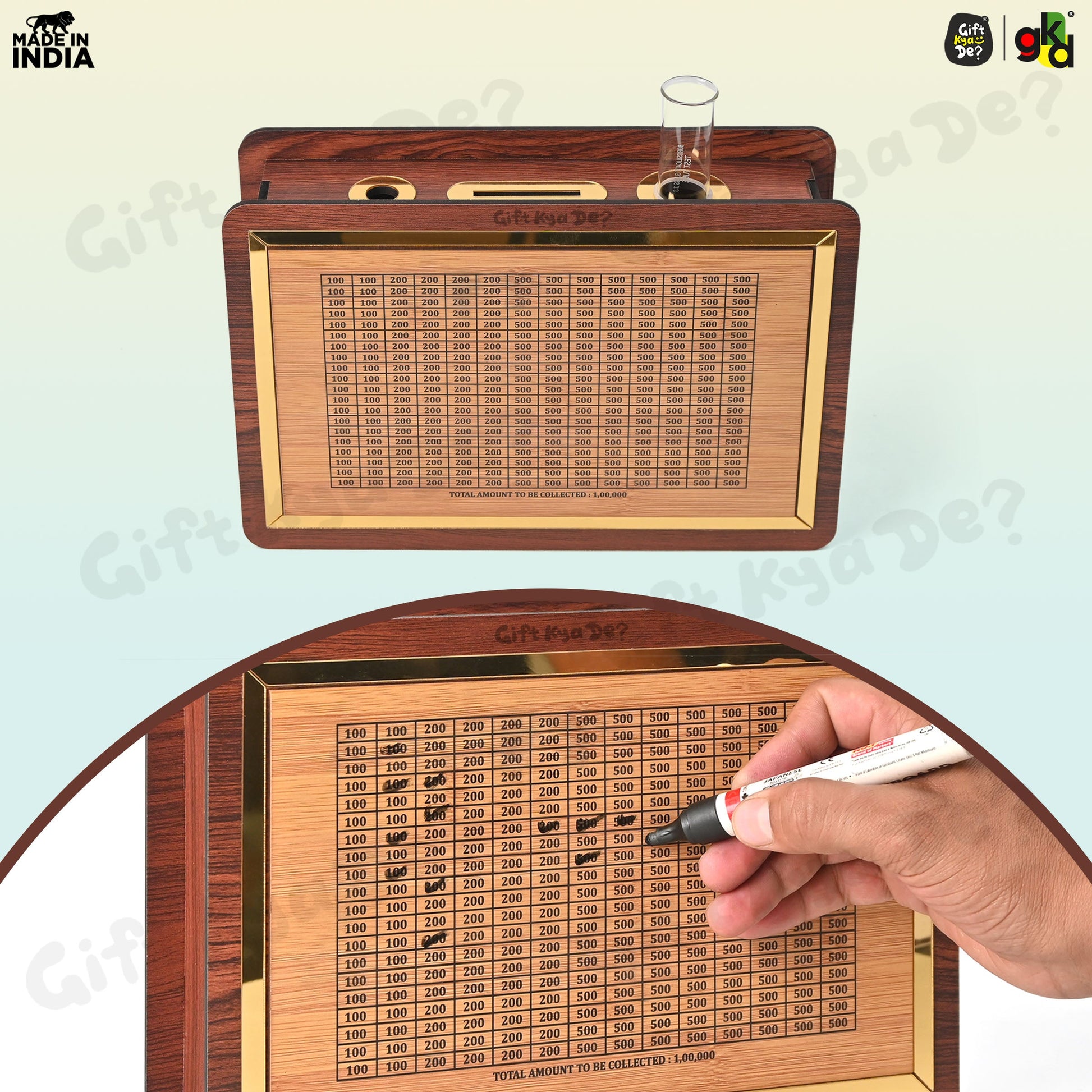 Introducing the Wooden Piggy Bank, a creative and interactive way to track savings! Designed with pre-marked denominations like ₹50, ₹100, ₹500, this unique wooden money bank allows you to cut off the amounts as you insert cash, making it a goal-oriented saving experience. The total savings goal is set at ₹1,00,000—an exciting challenge for kids and adults alike.