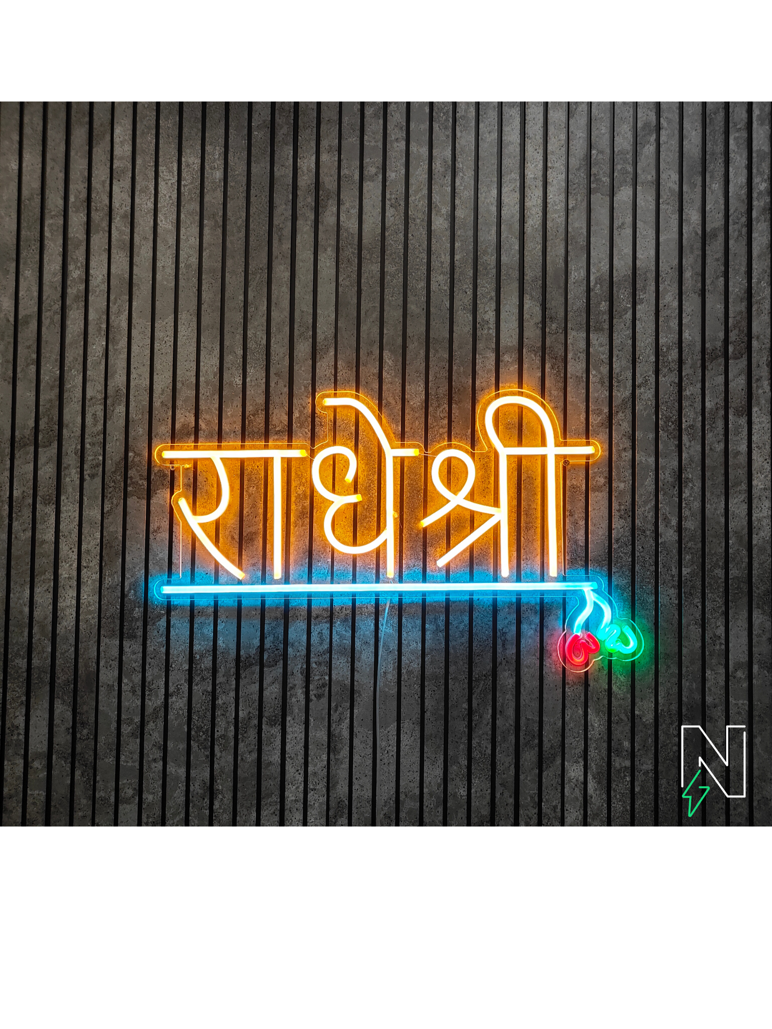 Bring home the sacred aura of devotion with our राधेश्री Neon Light. Crafted in vibrant orange script and adorned with a glowing blue flute design with a tassel, this stunning sign creates a spiritual ambiance wherever it shines.