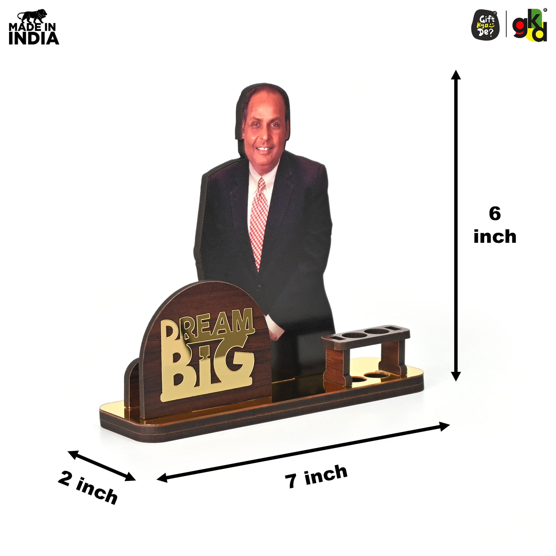 Celebrate the legacy of India’s legendary leaders with this “Dream Big” Wooden Table Top, featuring two inspiring variants – Ratan Tata and Dhirubhai Ambani. More than just a decorative piece, it’s a motivational desk companion designed with a built-in pen holder and visiting card slot to combine utility with inspiration.