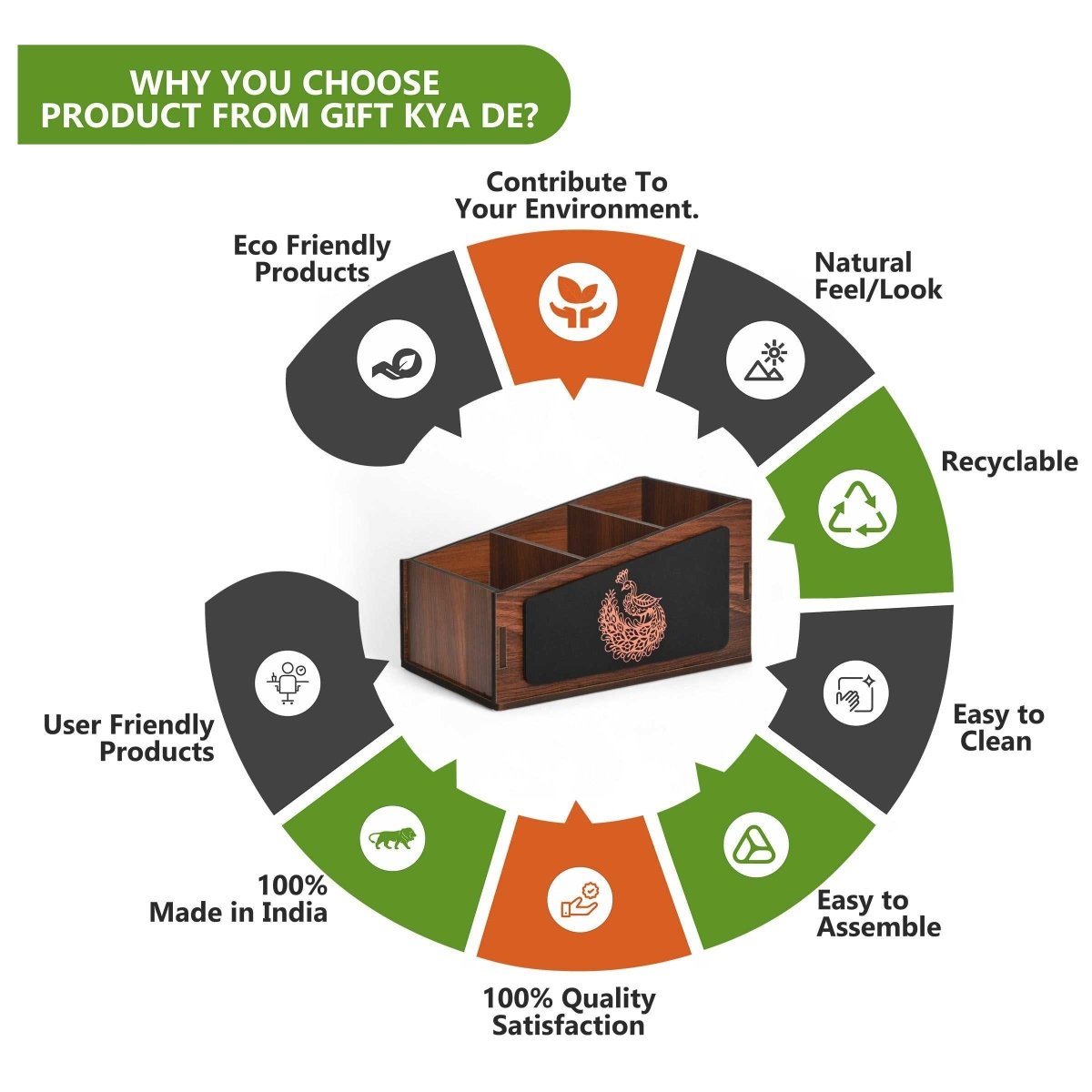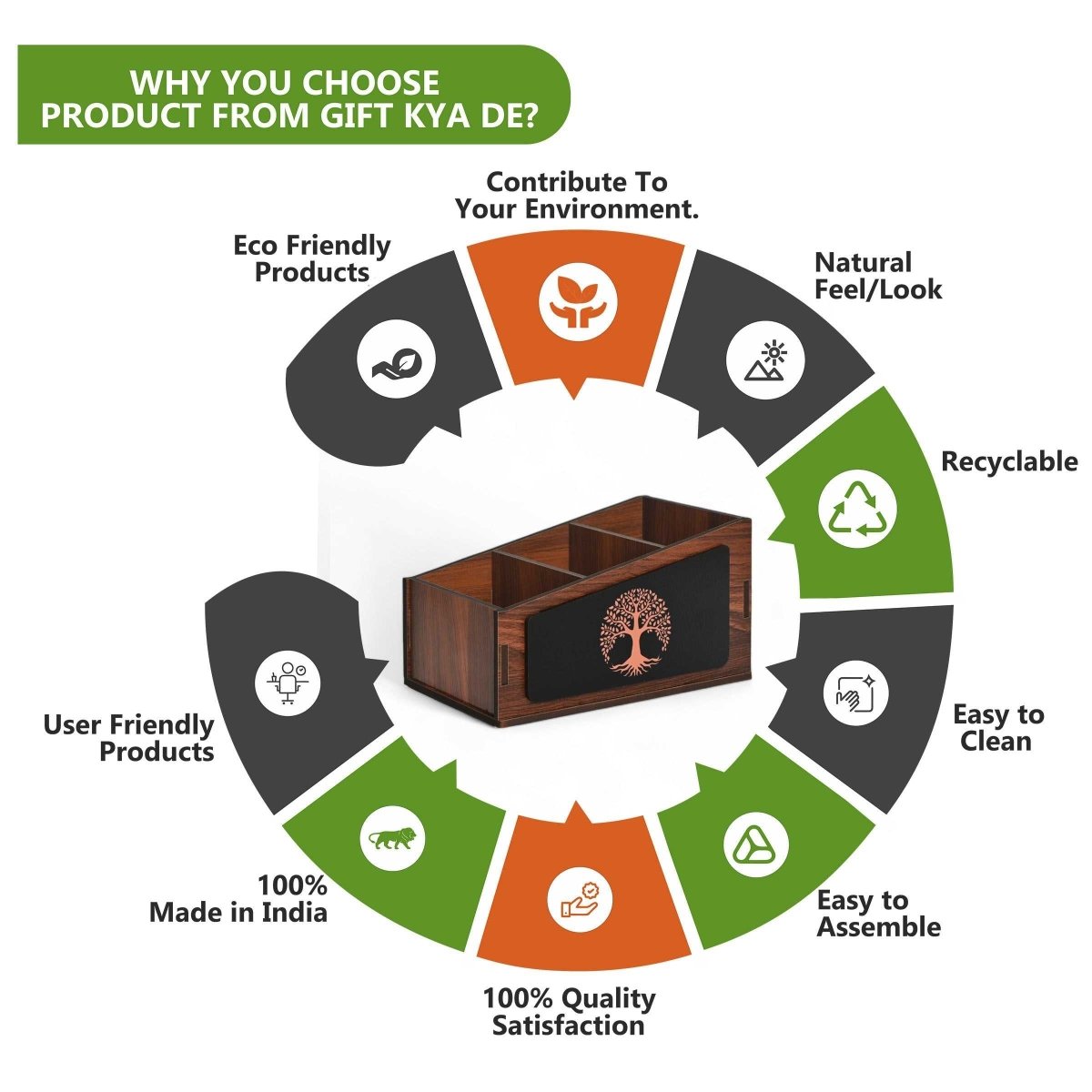 Uplift your living space with the eco-friendly and artistically crafted Gift by FusionEdge Wooden Remote Stand. Handcrafted by skilled artisans using sustainable materials, this desk organizer combines functionality with a touch of artistry. Its three sections offer ample storage for remotes, stationary, and more, while its durable build ensures long-lasting quality. Make a statement in your home or office with this environmentally conscious and stylish home storage organizer.