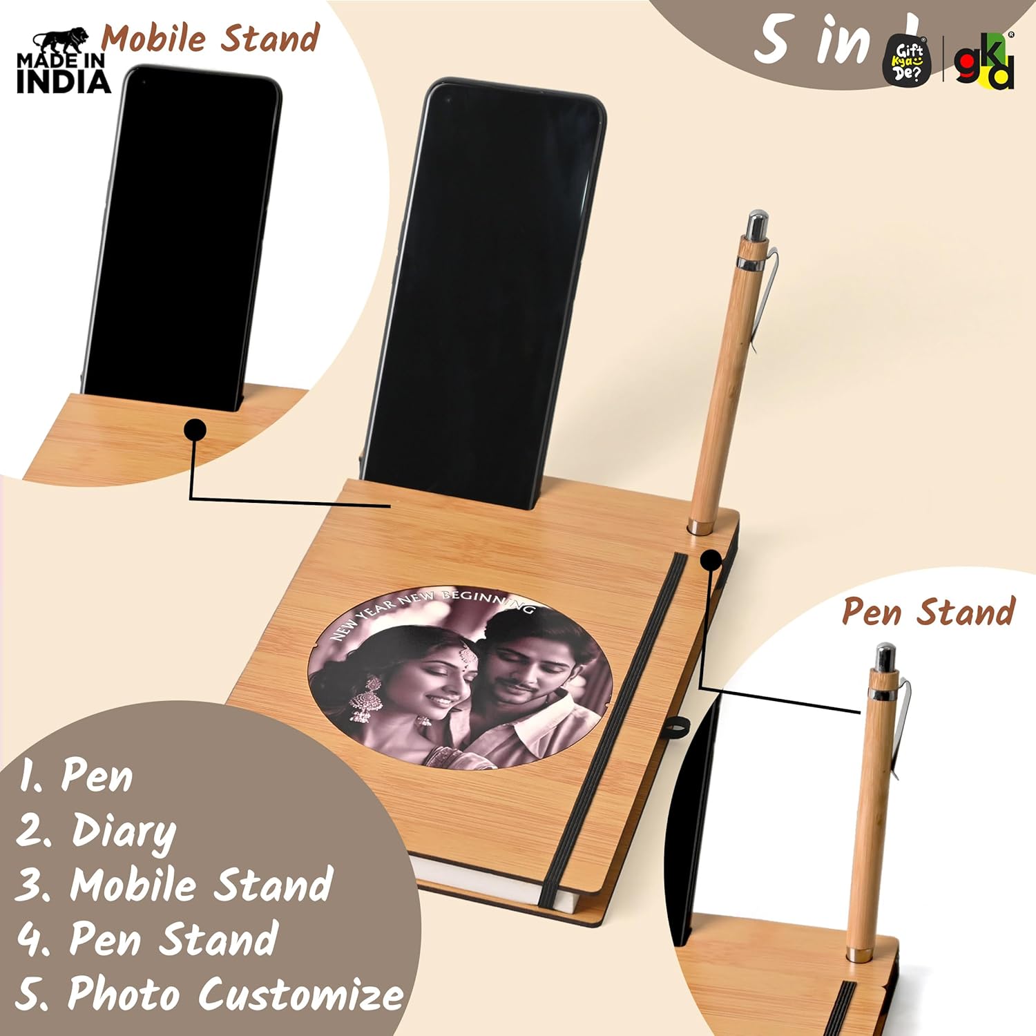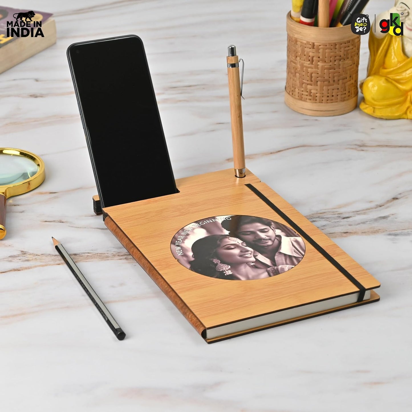 Wooden Diary with Mobile & Pen Stand | Customized Printed Photo/Logo or Motivational Quotes (Non-Customizable)